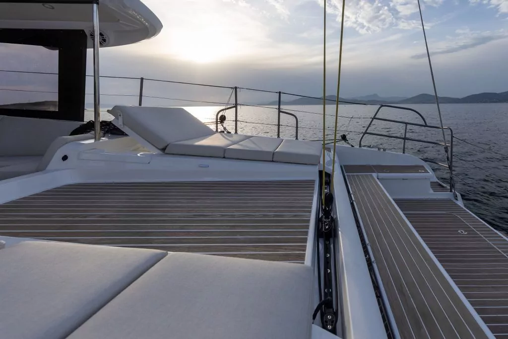 •The relaxation space, as a natural extension of the cockpit, featurestwo generous sun beds that can be turned into sofas. One couldlounge around, read a book, watch the stars, no to mention the sunset.