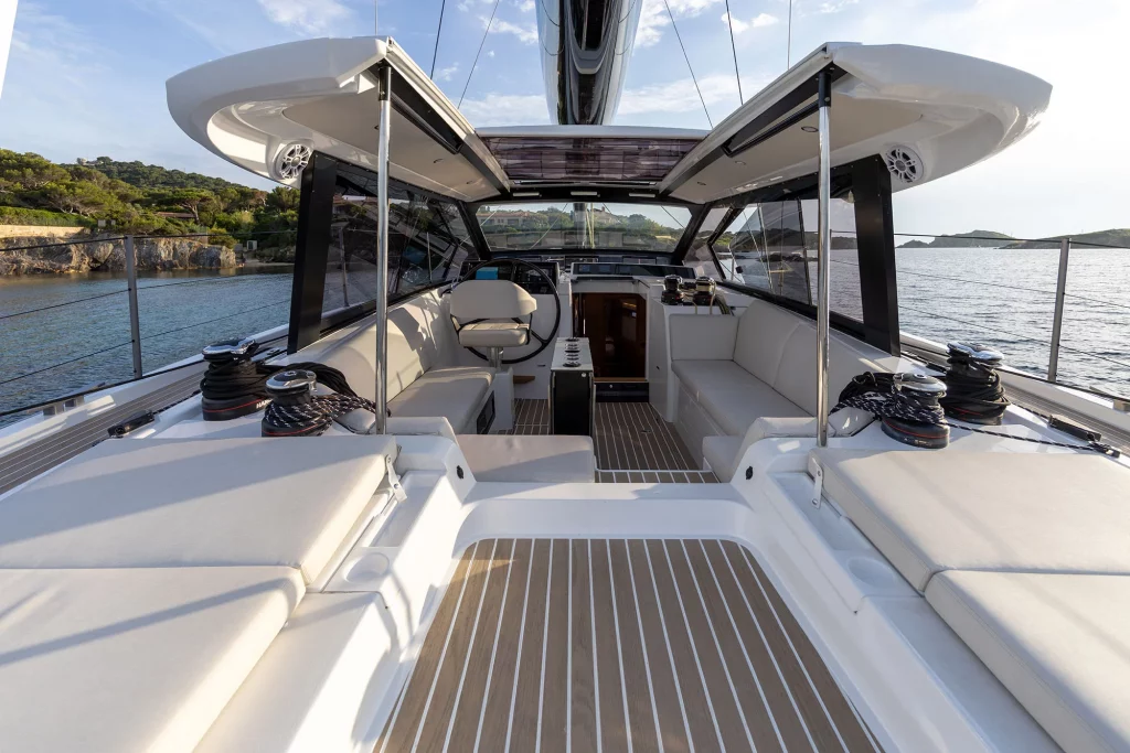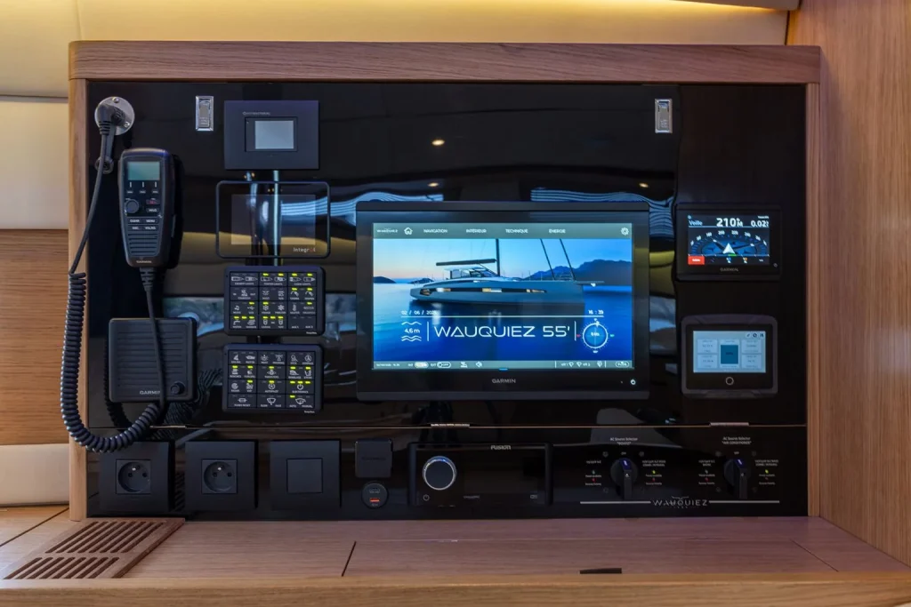 On deck as well as inside, the Wauquiez 55 offers an unmatchedlayout, focusing on simplicity, space and well-being, in total safety. •Her deck plan offers three distinct areas, each with a dedicatedvocation: •The navigation space welcomes all manoeuvres and the helmstation, and enables the captain to stay in touch with the rest of the crew. With a 360° vision on the marine environment, and a direct access to the saloon. When mooring, this space becomes a living and sharing area. •The relaxation space, as a natural extension of the cockpit, featurestwo generous sun beds that can be turned into sofas. One couldlounge around, read a book, watch the stars, no to mention the sunset. •The plaisance space, close to waterline, full-beam, is a privilegedarea to prepare a swimming session, get sun-dried, splash the water toys, scuba-dive or snorkel around. Of…