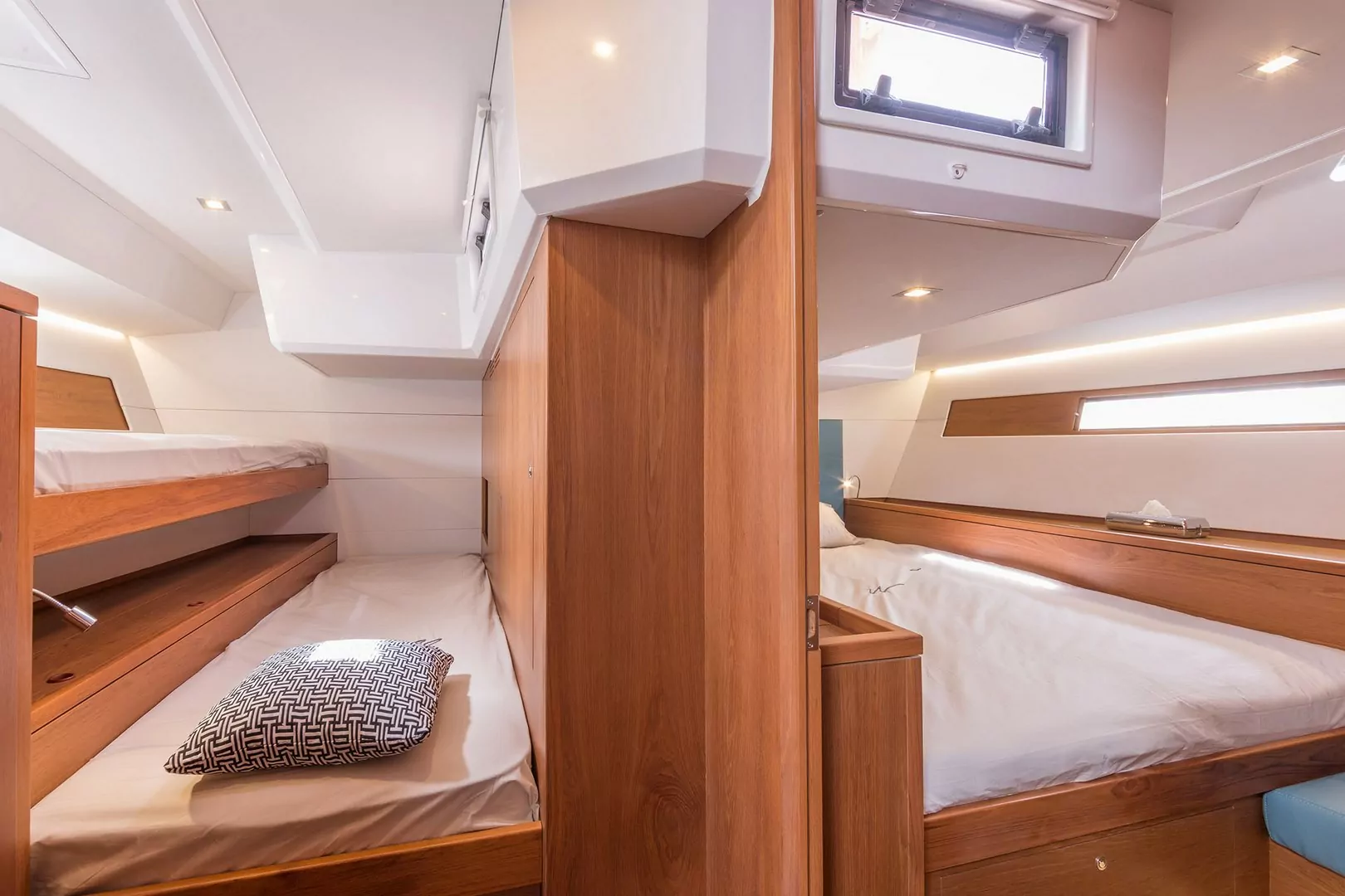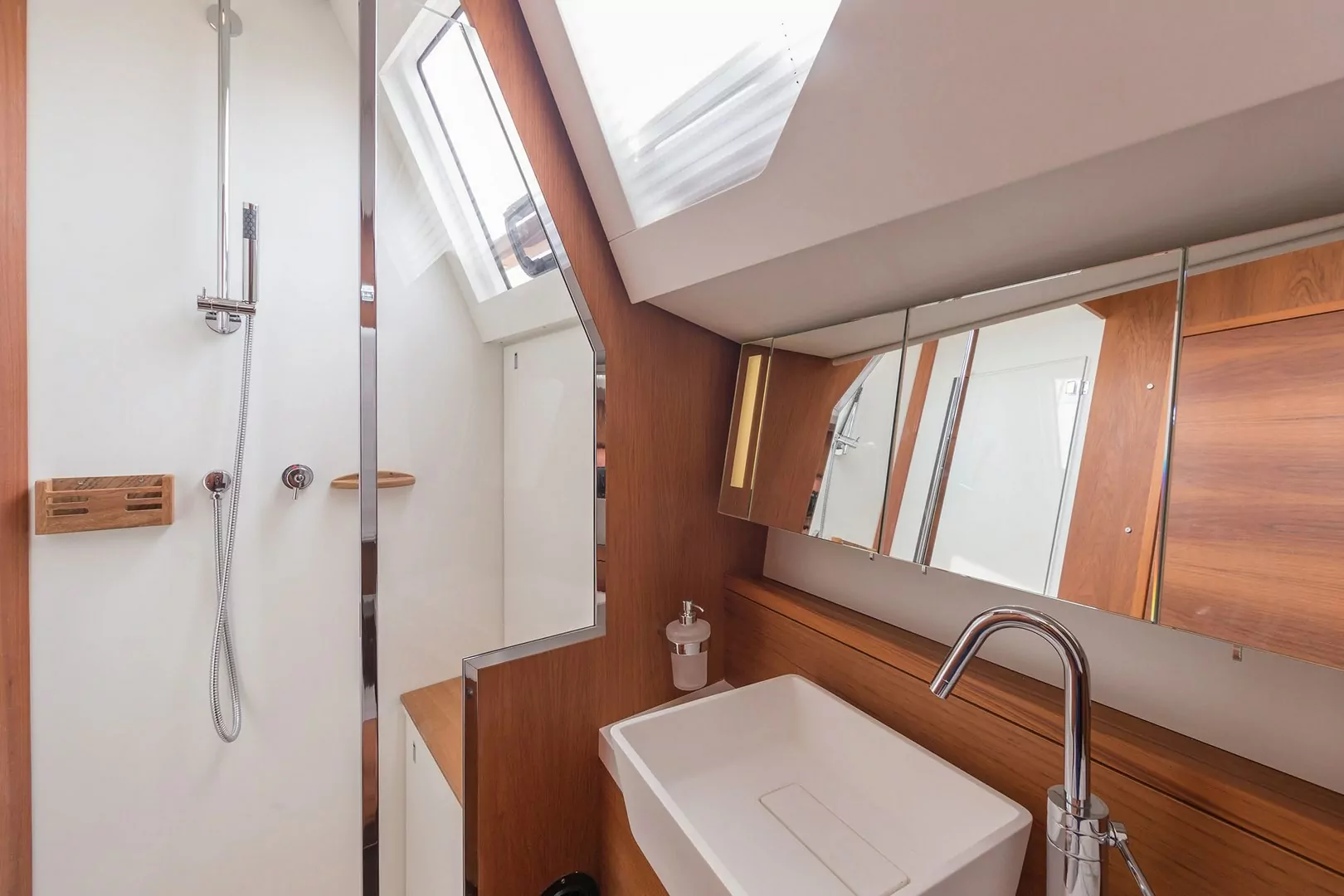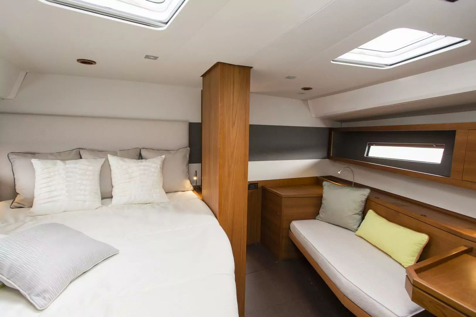 In this large luxury sailing yacht, the spacious owner’s cabin features an office and its own bathroom with a separate shower. Large hull windows provide ample natural light, and wide opening hatches ensure good cabin ventilation.