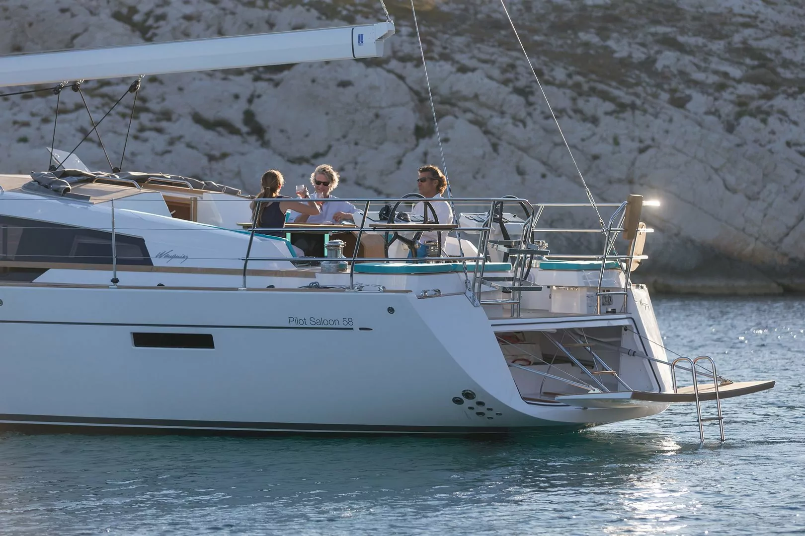 The hull, designed by Berret-Racoupeau Yacht Design, is powerful and versatile . It was conceived to tackle the most challenging sailing conditions . With a bulb keel and a 2.30-meter draft, the Pilot Saloon 58 is a stiff boat under sail and performs well on all points of sail . Two optional drafts are available: 2.10 m and 2.50 m. The swim platform transforms into a wide bathing platform and facilitates access to the tender garage.