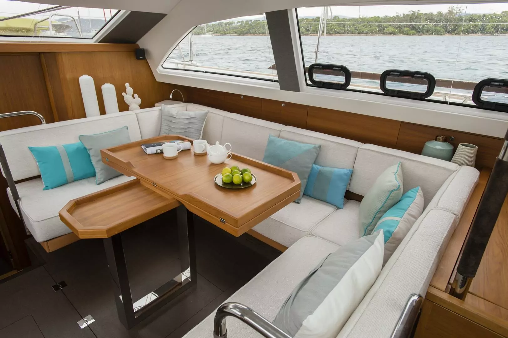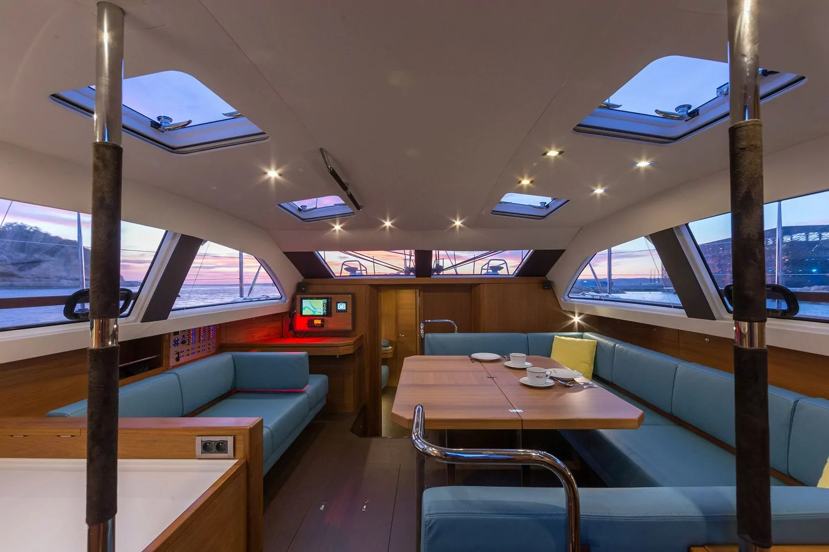 True to the innovative concept of a « real deck saloon, » the saloon is raised to ensure optimal natural light . Even when seated, the windows of this comfortable sailboat offer breathtaking sea views during cruises and world voyages. The onboard layout has been optimized, providing truly comfortable living spaces . Blending tradition and innovation, the saloon of this cruising sailboat is enhanced with reading lights and string lights beneath the lockers. The result of true craftsmanship , handrails wrap around the settees for added safety. The galley, located to port, is fully equipped .