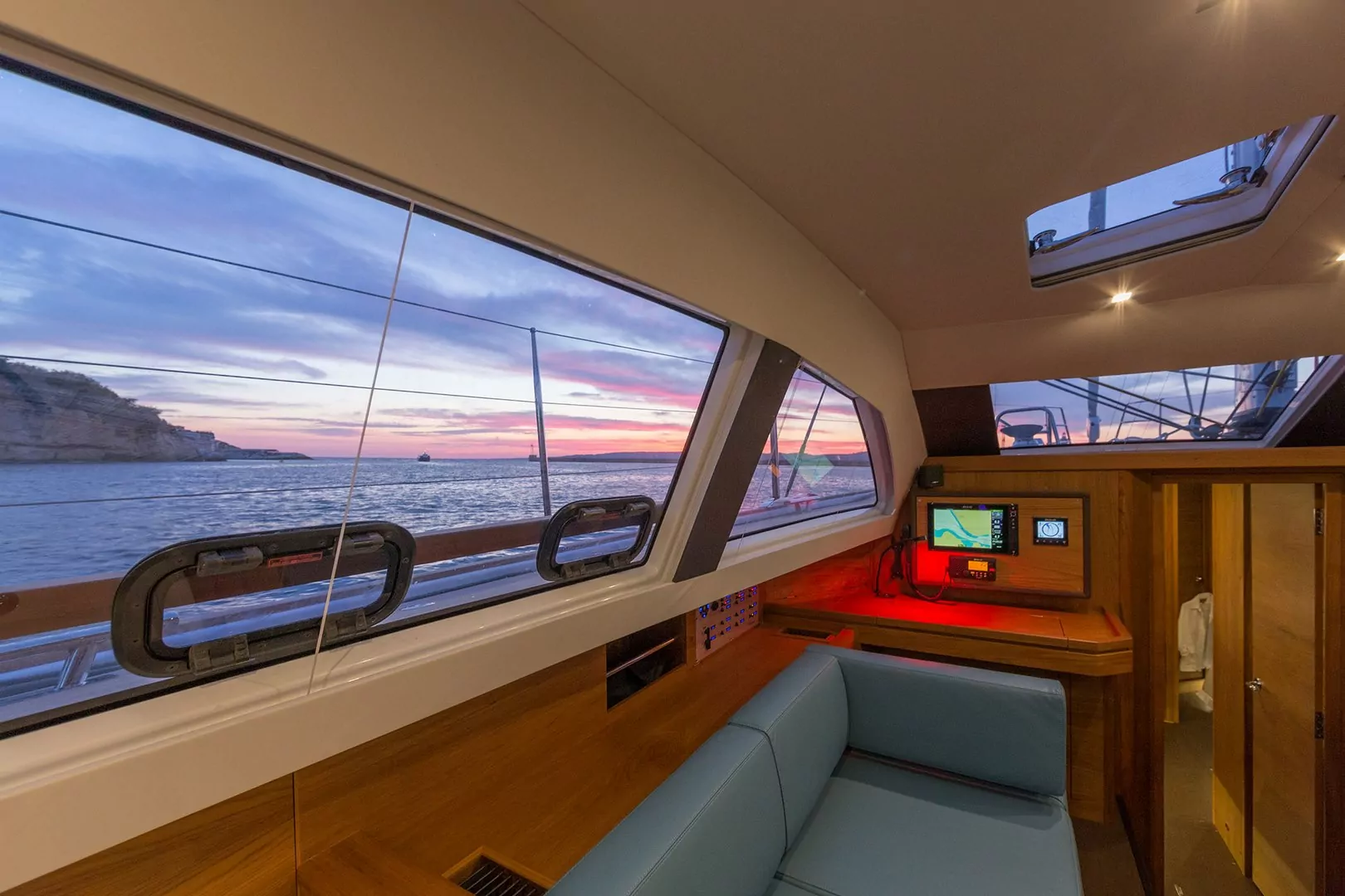 Fidèle au concept innovant du « vrai salon de pont », le carré est surélevé pour garantir une luminosité optimale. Même en position assise, les vitrages de ce voilier habitable offrent une vue imprenable sur la mer lors des croisières et tours du monde. Les volumes à bord ont été optimisés et proposent des espaces de vie vraiment confortables. Entre tradition et innovation, le carré de ce voilier de voyage est agrémenté de liseuses et guirlandes lumineuses sous les équipets. Fruits d’un véritable travail d’artisan, des mains courantes contournent les banquettes pour offrir toujours plus de sécurité. La cuisine située à bâbord est richement équipée.