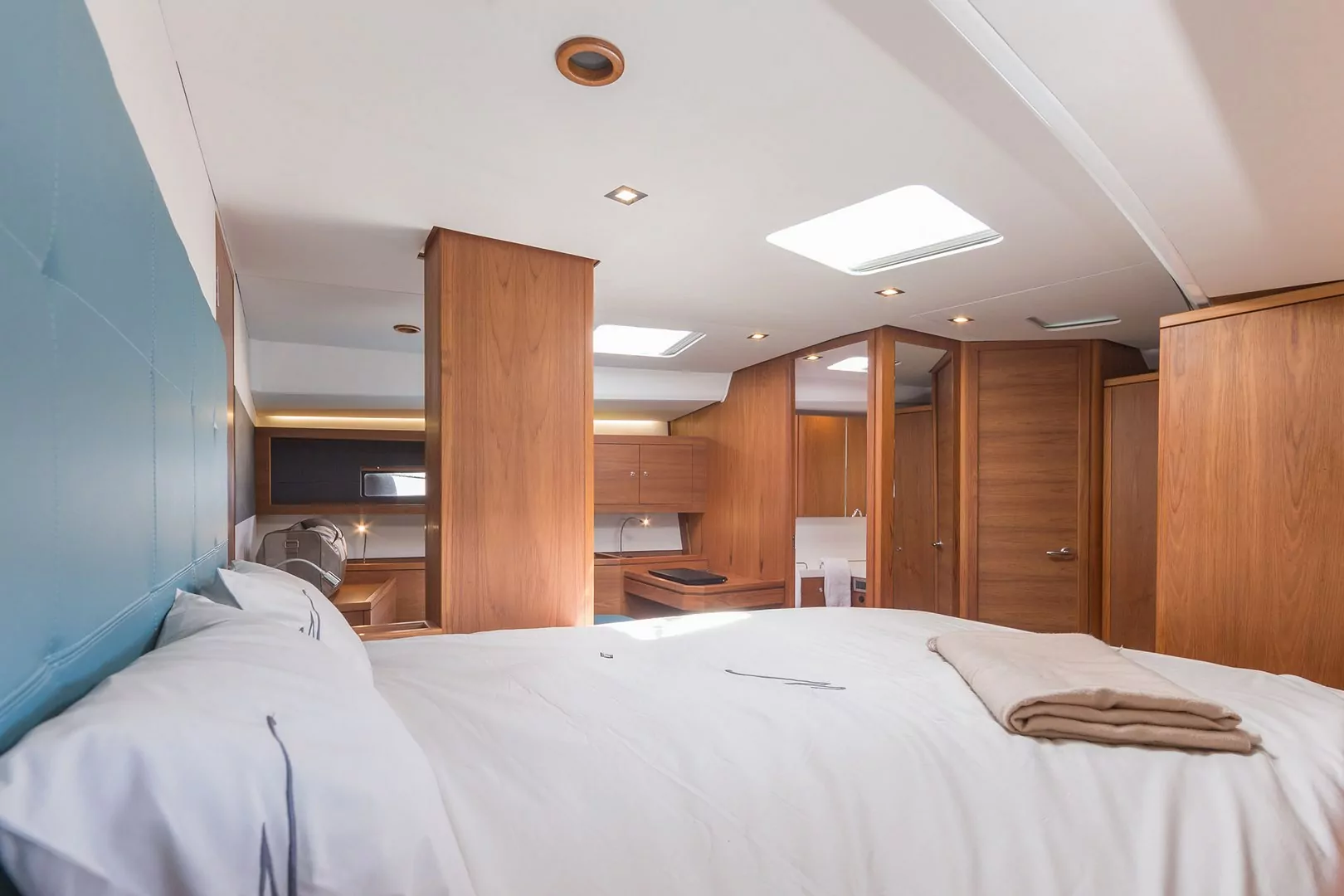 Dans ce grand voilier de luxe, la vaste cabine du propriétaire dispose d’un bureau et de sa propre salle d’eau avec douche séparée. De grands hublots de coques sont disposés pour la luminosité et de larges panneaux ouvrants permettent une bonne ventilation de la cabine.